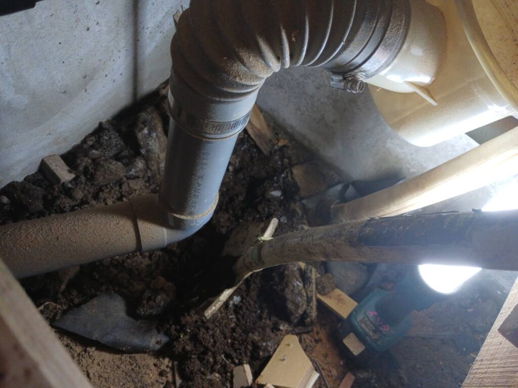 床下開口がないので、洗濯機を移動し排水開口部より床下土間配管を調査。