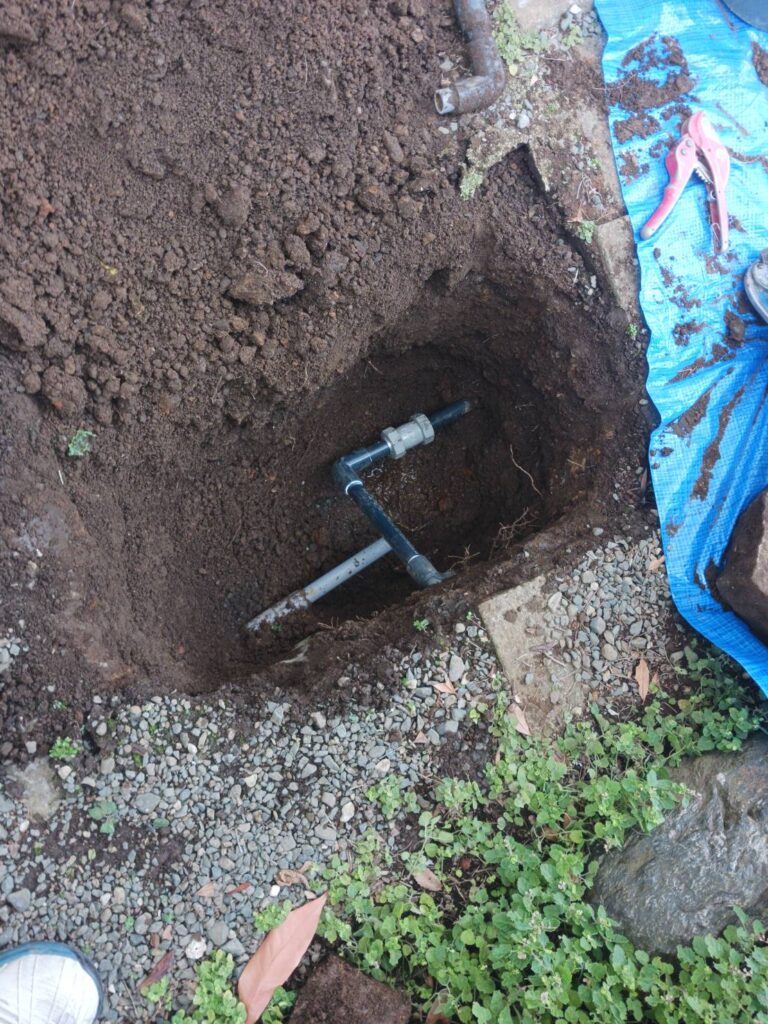 埋設部分で漏水している可能性があるので、数ヶ所で水圧テストして場所を見つけます。