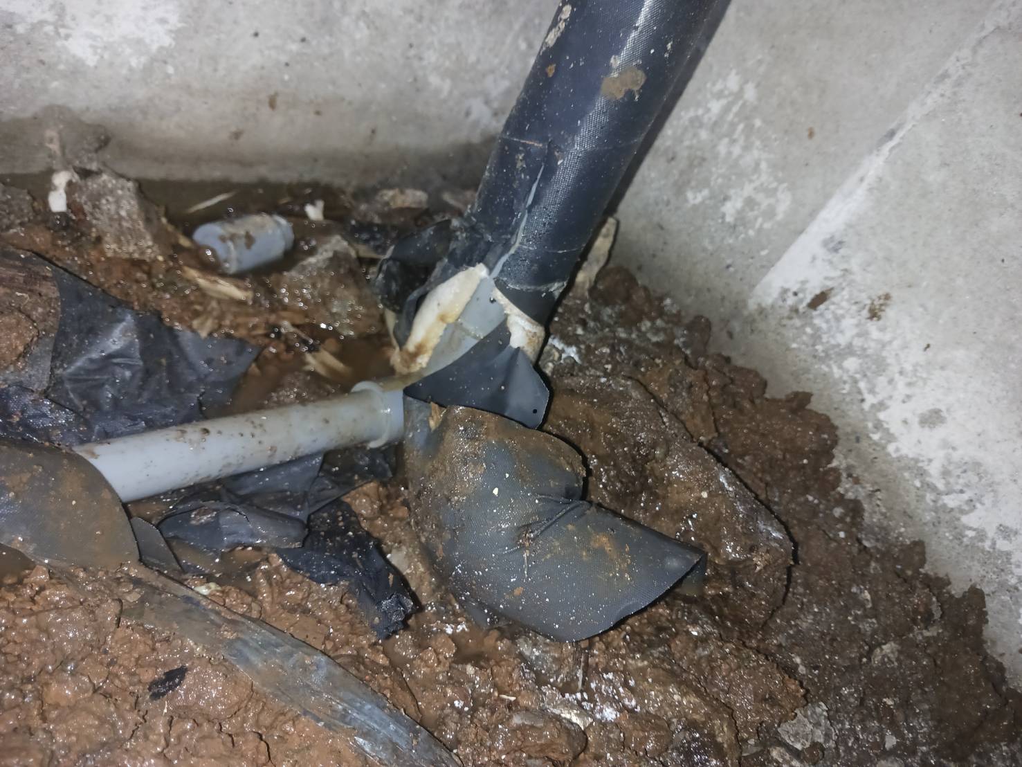 床下開口がないので、洗濯機を移動し排水開口部より床下土間配管を調査。